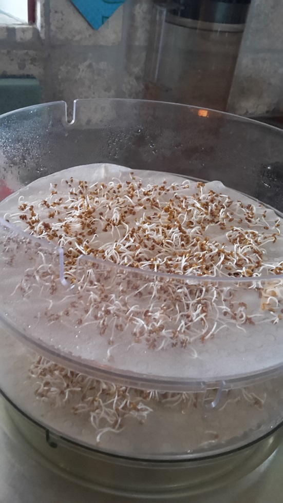 8 november - sköljda och blötlagda över natten, sen utströdda i två våningar, ställda i skafferiet innan de får komma fram i ljuset och få lite färg (ljuset och ljuset...det får nöja sig med det fjuttiga ljuset som finns, alltså i fönstret nu i november...tja...)